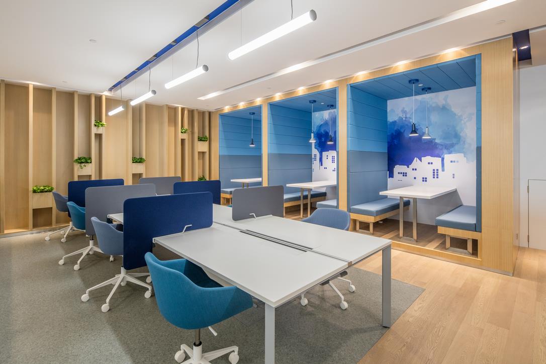 Adding a layer of comfort and privacy, booth seating with fabric upholstery is incorporated throughout the space. The textured backing and seating bring a tactile warmth to the design, creating cozy nooks for discussions, brainstorming sessions, or simply unwinding between tasks.